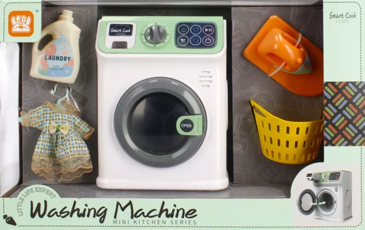 Zalety produktu pralka posiada efekty dźwiękowe oraz świetlne, posiada otwierane drzwiczki bębna, bęben pralki po włączeniu obraca się, posiada funkcje prania, płukania oraz wirowania, posiada wysuwana szufladę na proszek do prania, po skończonym praniu można je wyciągnąć ze środka, pralka w kolorze miętowym. Najwyższy czas aby zrobić pranie. Pozwól dziecku na wykonanie tej czynności domowej własnoręcznie we własnej pralce MEGA CREATIVE. Produkt ten idealnie odzwierciedla prawdziwy sprzęt domowy Zawartość zestawu pralka funkcyjna, kosz na pranie, deska do prasowania, żelazko, wieszak z ubraniem, imitacja butelki z płynem do prania. Produkt wykonany z plastiku oraz materiału. Wymiary/waga/baterie wymiary produktu dł. x wys. x gł. cm 16x22x12, wymiary opakowania dł. x wys. x gł. cm 44x28x15, waga produktu bez opakowania kg 0,62 kg, waga produktu w opakowaniu kg 0,99 kg, wymaga zasilania bateriami 3 x AALR06-nie załączono do zestawu. Zabawka przeznaczona dla dzieci w wieku 3 . Pakowana w kartonik z okienkiem. W kartonie zbiorczym po 9 szt.