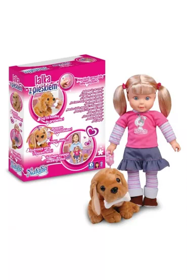 Lalka 42 cm., mówi po polsku, piesek: szczeka, mówi 11 fraz, rusza główką, podnosiu uszy do góry, cieszy się, poszczekuje, reaguje na kostkę, Wym. Opk: 26 x 43 x 13 cm Wiek: 3+