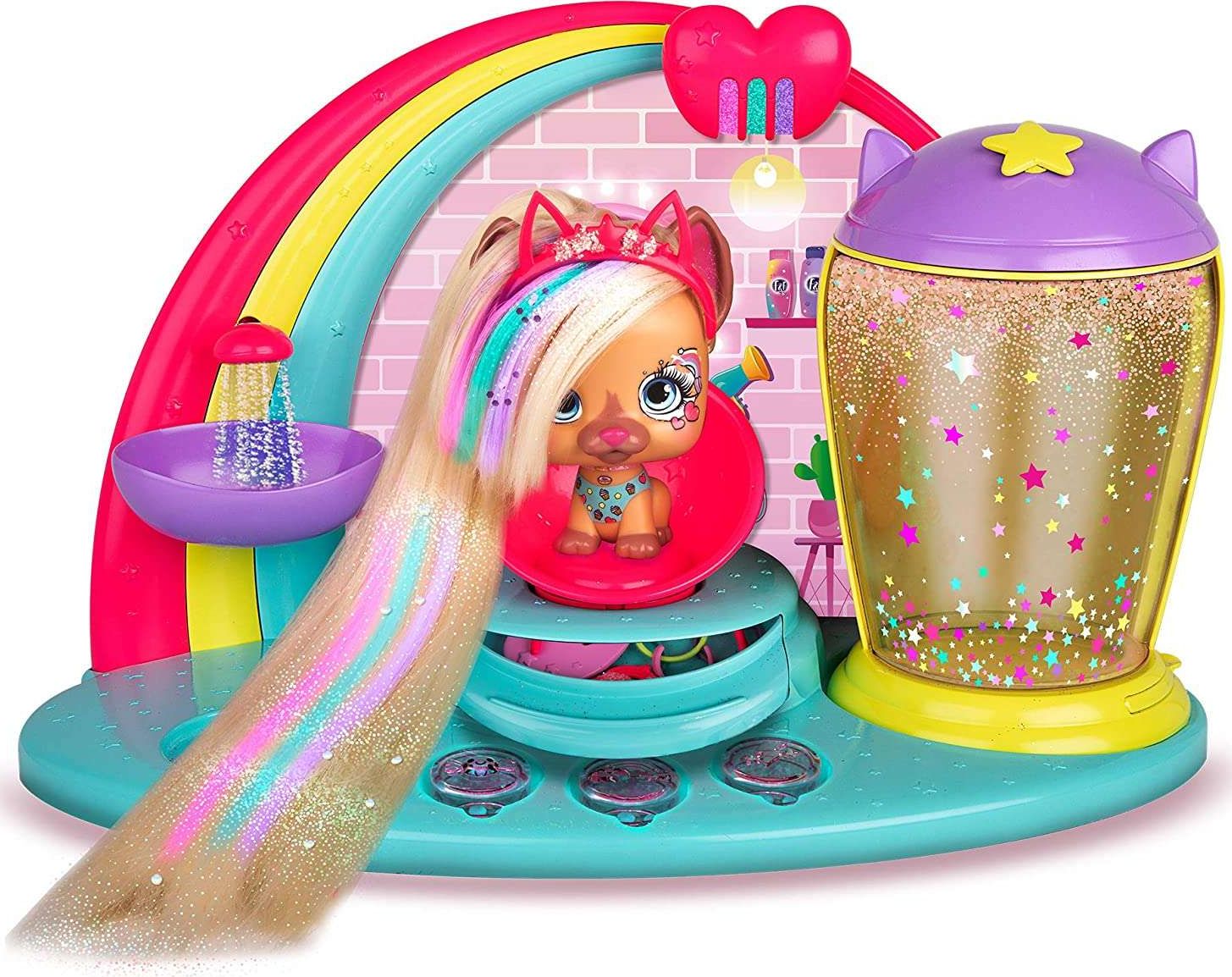 Zestaw składa się z wyjątkowego brązowego pieska o pięknych, długich blond włosach z kolorowymi pasemkami oraz salon fryzjerski. Włosy pieska można czesać, ozdabiać i upinać na różne sposoby, dzięki wielu załączonym akcesoriom. Salon działa z wodą i pozwala na mycie włosów pieska.