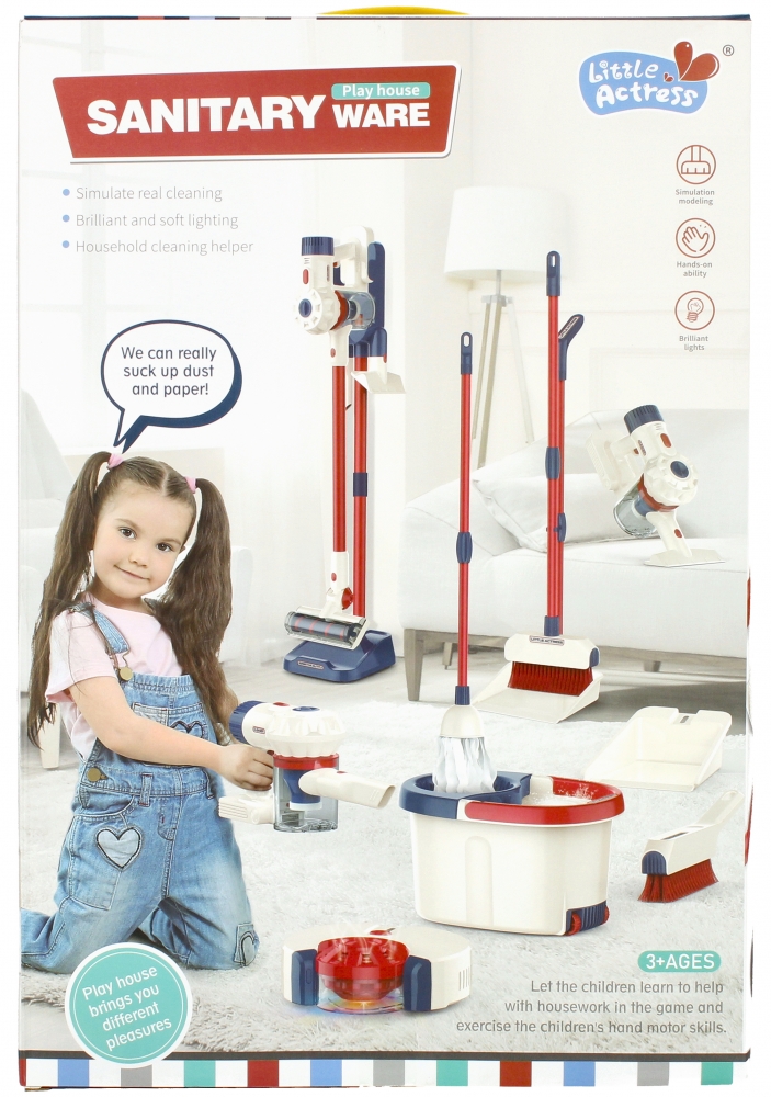 Zawartość zestawu: odkurzacz, robot sprzątający, mop z wiadrem, szufelka z miotłą, szufelka ze zmiotką wszystko to imitacja prawdziwych produkt and oacute w do sprzątania.