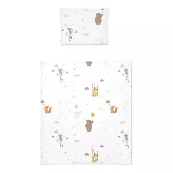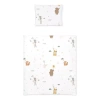 Kołderka i poduszka Mini to zestaw, który świetnie sprawdzi się w łóżeczkach dostawnych, gondoli wózka lub koszach Mojżesza. Dwustronna kołderka wykonana została z jednej strony z bawełnianej tkaniny z kolorowym nadrukiem motywu króliczka, z drugiej natomiast zastosowany został jednobarwna tkanina Velvet. W środku wszyta na stałe została antyalergiczna włóknina silkonowana, która zapewnia ciepło oraz wygodę użytkowania. W zestawie znajduje się również dwustronna płaska poduszka, która sprawia, że główka dziecka się w nią nie zapada, a przez to jest dla niego bezpieczna.