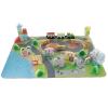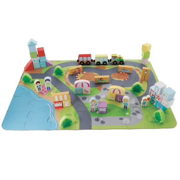 Zbuduj wesołe miasteczko: koło widokowe, karuzelę, kasę, sklepik. W zestawie znajdziecie: 5 figurek postaci oraz ciuchcię z wagonikami połączonymi magnesem. Kolejnym elementem zestawu jest mata puzzlowa o wymiarach 43x60 cm, która została zaprojektowana tak, by dziecko bawiąc się, rozwijało umiejętności manipulacyjne rąk.
