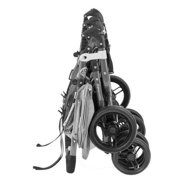 Płynnym ruchem w przód możemy łatwo złożyć spacerówkę oraz przenosić ją jak torbę, na pasku.Nie musimy obawiać się, o zabrudzenie tapicerki wózka, gdyż będzie schowana do wewnątrz.