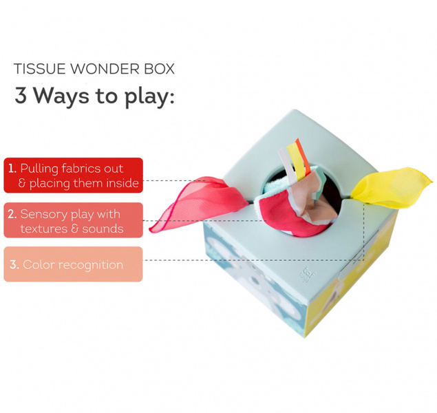 Sensoryczne Pudełko na Chusteczki od Taf Toys to innowacyjna zabawka, która łączy zabawę i rozwój! Z myślą o fascynacji dzieci pudełkami i chusteczkami, oferuje 10 kolorowych tkanin, które zachęcają do wyciągania i odkrywania. 🌟