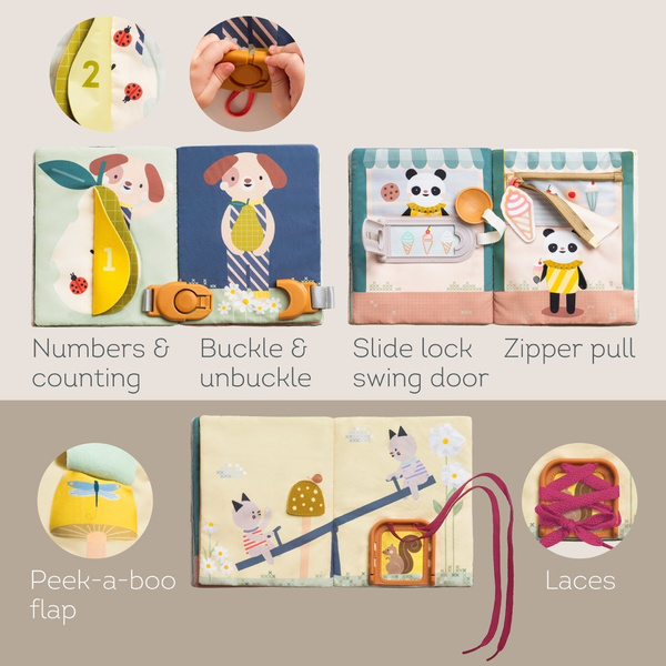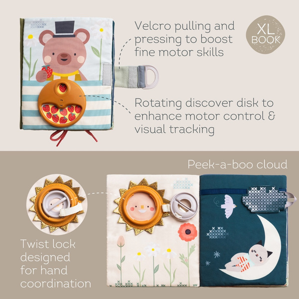 Taf Toys Fantasy Busy Book – Przeciwieństwa 📖 to niezwykła edukacyjna książeczka aktywnościowa, która rozwija maluszka przez zabawę! Przeznaczona dla dzieci od 18 miesiąca życia, zawiera aż 15 interaktywnych aktywności, które wspierają rozwój umiejętności motorycznych, poznawczych i językowych.
