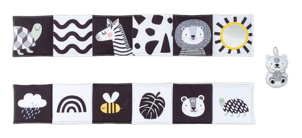 Taf Toys Książeczka Kontrastowa – Savannah to dwustronna, miękka książeczka z przyjaznymi, czarno-białymi ilustracjami i uroczą szeleszczącą maskotką – lwiątkiem Libby 🦁. Książeczka stymuluje wzrok, rozwija koordynację oraz wspiera rozwój emocjonalny dzięki kontrastom, fakturom i ukrytemu lusterku. Idealna do zabawy na brzuszku, w łóżeczku lub w wózku – wszędzie tam, gdzie Twój maluszek potrzebuje stymulacji i rozrywki 💡👶🖤🤍