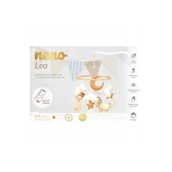 Karuzela Neno Leo to subtelna i stylowa dekoracja łóżeczka, która pełni także funkcję wspierającą rozwój dziecka. Ręcznie wykonane maskotki z miękkiego filcu przyciągają uwagę maluszka i zachęcają do obserwacji, wspomagając rozwój wzroku i koordynacji. Delikatne kolory wprowadzają spokój do pokoju, sprzyjając relaksowi i zasypianiu.