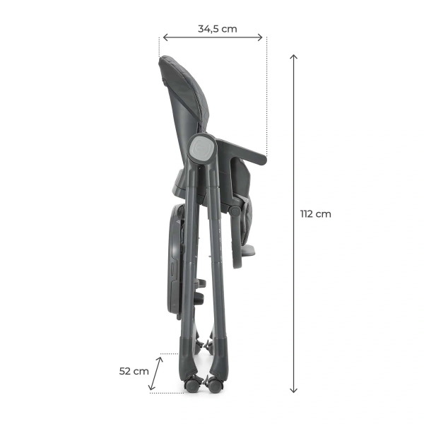 Wbudowane kółka z hamulcami, 5-punktowe pasy bezpieczeństwa oraz miękka, łatwa w czyszczeniu tapicerka z PU zwiększają wygodę i bezpieczeństwo dziecka. Po złożeniu krzesełko ma wyjątkowo kompaktową formę, co znacznie ułatwia jego przechowywanie. Zajmuje minimum miejsca, więc bez problemu zmieści się w kącie lub szafie.