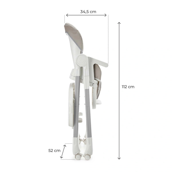 Wbudowane kółka z hamulcami, 5-punktowe pasy bezpieczeństwa oraz miękka, łatwa w czyszczeniu tapicerka z PU zwiększają wygodę i bezpieczeństwo dziecka. Po złożeniu krzesełko ma wyjątkowo kompaktową formę, co znacznie ułatwia jego przechowywanie. Zajmuje minimum miejsca, więc bez problemu zmieści się w kącie lub szafie.