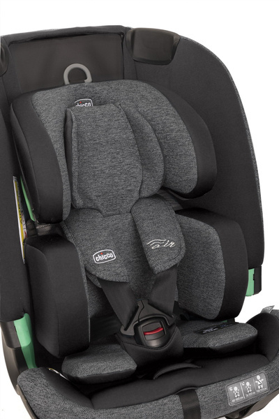 został zintegrowany z 5 punktowymi pasami bezpieczeństwa, co pozwala na precyzyjne dopasowanie zagłówka i pasów do wzrostu dziecka.
