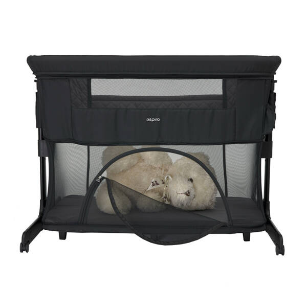 Łóżeczko posiada mięciutki materac, który jest otoczony wysokimi ściankami. Z obu stron umieszczono drzwiczki, przez które rodzic może podać dziecku na przykład smoczek.