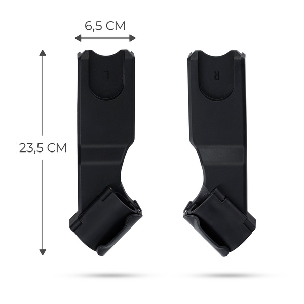 Kompatybilne z nosidełkami Kinderkraft (MINK PRO i-Size) Razem z fotelikiem tworzą praktyczny TRAVEL SYSTEM Łatwo je wpiąć i wypiąć z ramy wózka Zestaw 2 adapterów