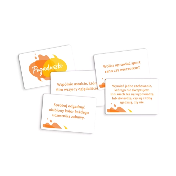 "Seria „Pogaduszki” to zestawy kart z pytaniami, które zachęcają do niebanalnych rozmów, poruszania w nich niecodziennych tematów i lepszego poznawania siebie i innych. „Pogaduszki” to świetny dodatek do każdego rodzaju spotkań, ułatwiający dzielenie się przeżyciami i pogłębianie relacji.
