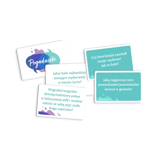 "Seria „Pogaduszki” to zestawy kart z pytaniami, które zachęcają do niebanalnych rozmów, poruszania w nich niecodziennych tematów i lepszego poznawania siebie i innych. „Pogaduszki” to świetny dodatek do każdego rodzaju spotkań, ułatwiający dzielenie się przeżyciami i pogłębianie relacji.