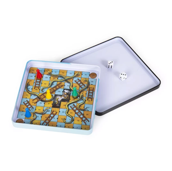 Magnetyczne opakowanie z planszą przyciąga pionki, dzięki czemu gra jest możliwa nawet podczas jazdy, bo nic na planszy nie przestawi się bez naszej woli. Celem gry jest ustawienie swojego pionka na ostatnim polu na planszy. Na drodze znajdują się węże, które mogą utrudnić ruchy. Zwróćcie uwagę również na drabiny, można z nich skorzystać jako skrótu.