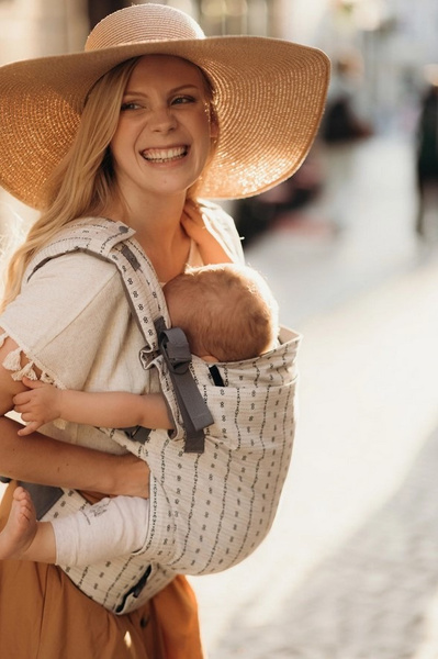 Wszechstronny design dopasuje się do każdej fazy noszenia dziecka, zarówno z przodu, jak i z tyłu. Został zaprojektowany, aby w pełni wspierać naturalną ergonomiczną pozycję dziecka, promując zdrowy rozwój bioder i kręgosłupa!