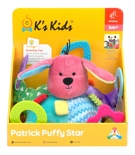 Miękka, pluszowa zabawka Patrick w kształcie gwiazdki posiada wiele kolorów, tekstur i gryzaków. To bomba sensoryczna dla Twojego maluszka!