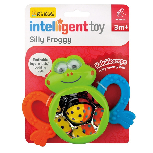 Zabawka żabka wydaje grzechoczące dźwięki, posiada różne tekstury, nóżki, które służą jako gryzak i obracającą się, kalejdoskopową kulę, która pobudza zmysły dzieci.
