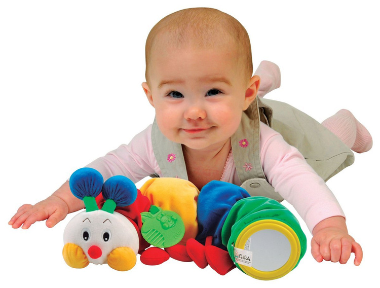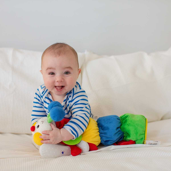 Metoda: Gąsienica jest wykonana z różnych materiałów. Zachęcaj dziecko, by dotykało zabawki i odczuwało jego różne faktury oraz aby żuło gryzak.