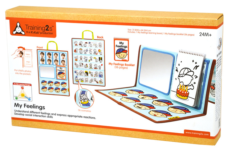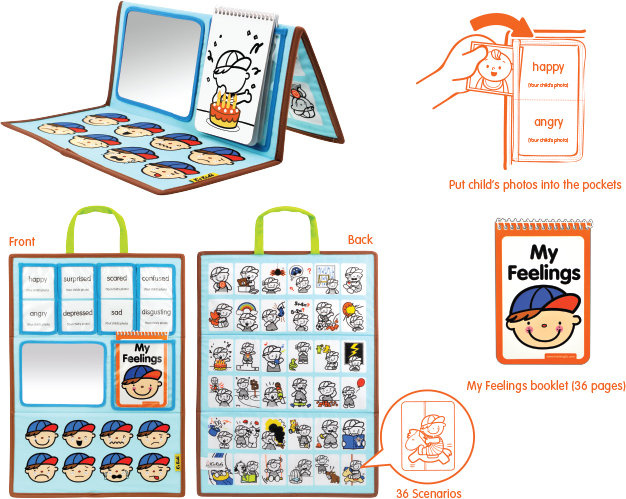 Książeczka z 36 różnymi scenkami pozwala zrozumieć uczucia i reakcje w różnych sytuacjach. Dziecko może naśladować wyrazy twarzy w lustrze przez co rozpoznaje swoje włąsne uczucia. Rodzice mogą zrobić zdjęcia dzieciom z różnymi wyrazami twarzy i umieścić je na tablicy "Moje uczucia", wtedy może ono przypominać sobie własne minki.