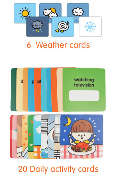Zabawka Mój dzień pomaga dzieciom rozwijać zdolności organizacyjne, sekwencjonowanie i umiejętności językowe. Dzieci mogą organizować własny dzień przy użyciu 20 kart codziennych aktywności. Wybierz planowane działania i umieścić karty w kieszeni według kolejności. Zabawa ta pomaga dzieciom zrozumieć, co należy robić o konkretnej godzinie i co należy zrobić następnie. Rodzice mogą zachęcać dzieci do opisania tego, co zrobili. Takie ćwiczenia poprawią komunikację i umiejętności językowych dzieci.