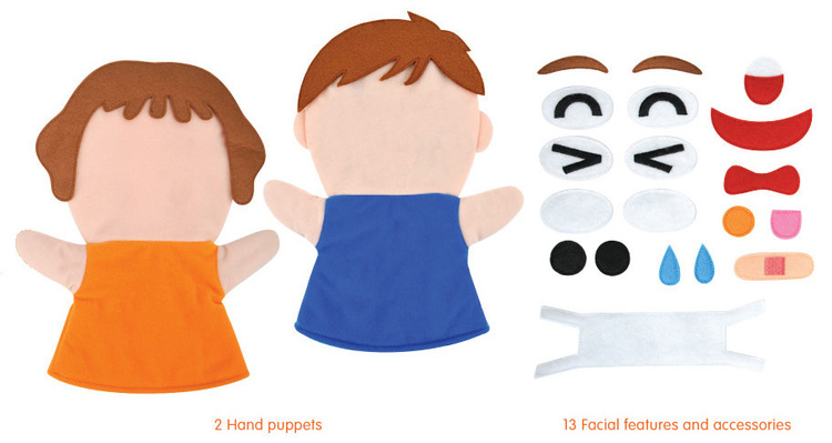 Zestaw zawiera dwie tekstylne pacynki i różne rysy twarzy oraz akcesoria. Rodzice mogą umieszczać oczy, usta i brwi w różnych miejscach aby pokazać różne emocje i pomóc dzieciom je zrozumieć.