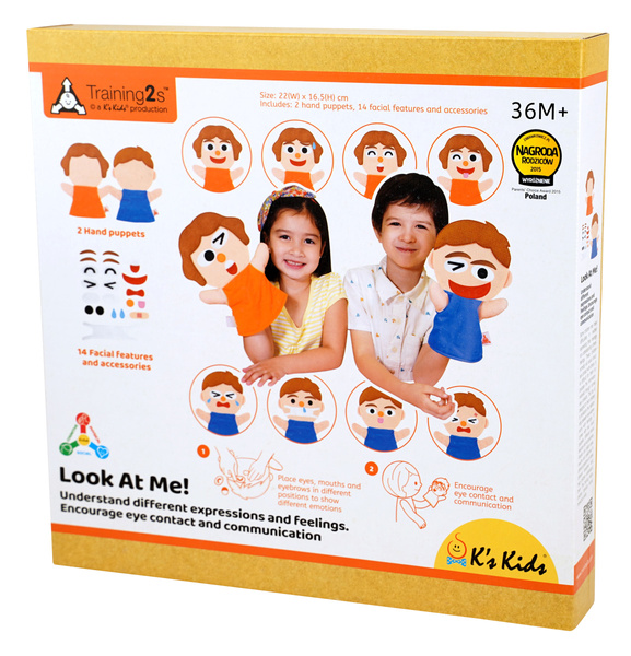 Niektóre dzieci mogą mieć trudności w wyrażaniu uczuć oraz rozumieniu uczuć innych. Dzieci te zwykle będą unikać bezpośredniego kontaktu wzrokowego z innymi. Tym dzieciom sprawia również trudność przetwarzanie informacji otrzymanych przez kontakt wzrokowy innych osób. Ta zabawka jest zaprojektowana tak, aby pomóc dzieciom zapoznać się z tym jakie emocje wyraża wzrok innej osoby, co oznacza. Zestaw zawiera dwie pacynki i różne rysy twarzy oraz akcesoria. Rodzice mogą umieszczać oczy, usta i brwi w różnych miejscach aby pokazać różne emocje i pomóc dzieciom je zrozumieć. Ćwiczenie to pomaga dzieciom rozwijać umiejętności społeczne i uczyć kontaktu z innymi.