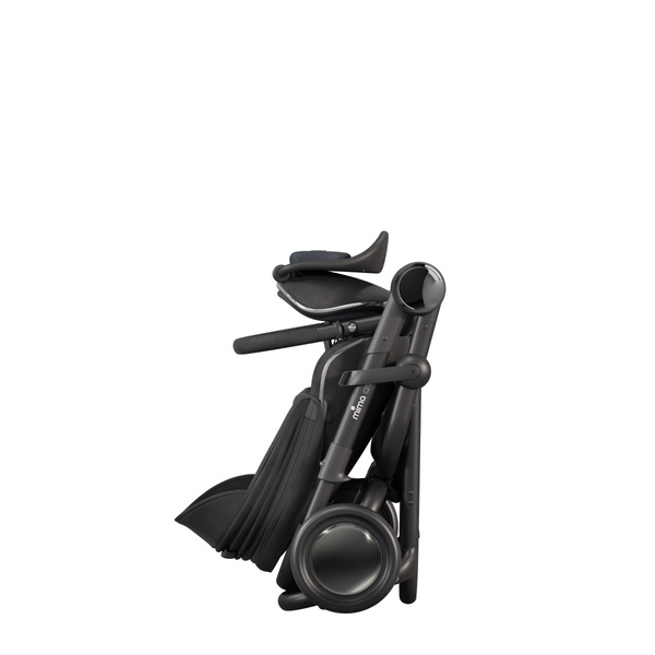 Wózek Mima Creo można złożyć razem z zamontowanym siedziskiem (siedzisko musi znajdować się w górnej pozycji, skierowane przodem do kierunku jazdy).