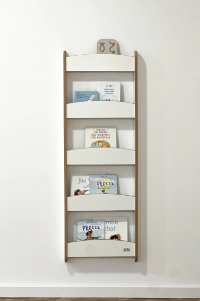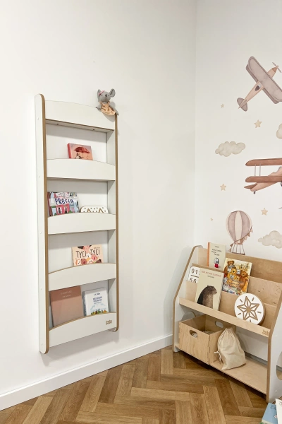 Wyobraź sobie biblioteczkę, która nie tylko pomaga utrzymać porządek, ale też staje się częścią codziennych rytuałów. Trzy poziomy świetnie pomieszczą książeczki, pamiątki i wszystkie te drobiazgi, które mają znaczenie dla Twojego dziecka. Wysokość? Wybierasz Ty. Na niższym poziomie książeczki są zawsze w zasięgu małych rączek; wyżej – rodzic może czuwać nad porządkiem. A do tego urocza falbanka, która dodaje całości ciepła i sprawia, że książki stają się elementem wystroju.