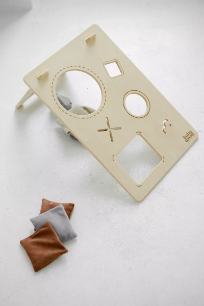 Plansza została wykonana z wysokiej jakości sklejki brzozowej o grubości 15 mm. Woreczki uszyliśmy z najwyższej jakości materiału z certyfikatem OEKO-TEX, które wypełnione są mikrokulką szklaną co zapewnia wyjątkową trwałość i bezpieczeństwo. Jest to materiał elastyczny i odporny na zużycie, nie zawierający szkodliwych substancji chemicznych. Różne kolory woreczków pozwalają na dzielenie się nimi z innymi Maluchami i swobodny wybór ulubionej wersji.