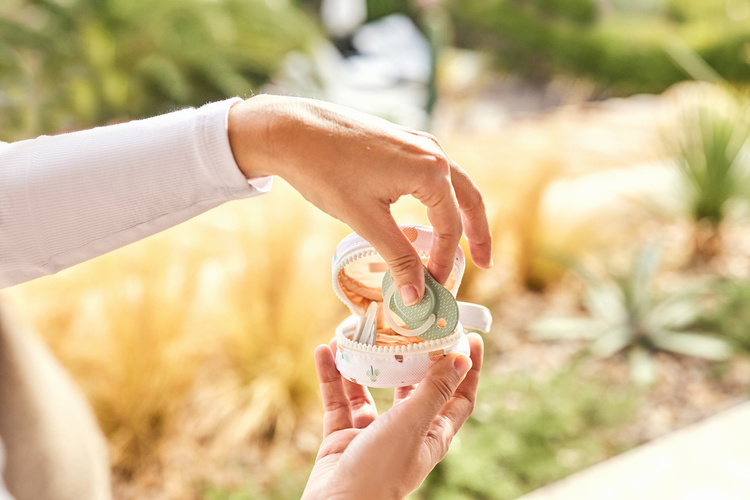 Zawiera uchwyt zakończony przyciskiem, dzięki któremu etui można przymocować do kołyski, łóżeczka, wózka lub torebki. W ten sposób zawsze masz go pod ręką.