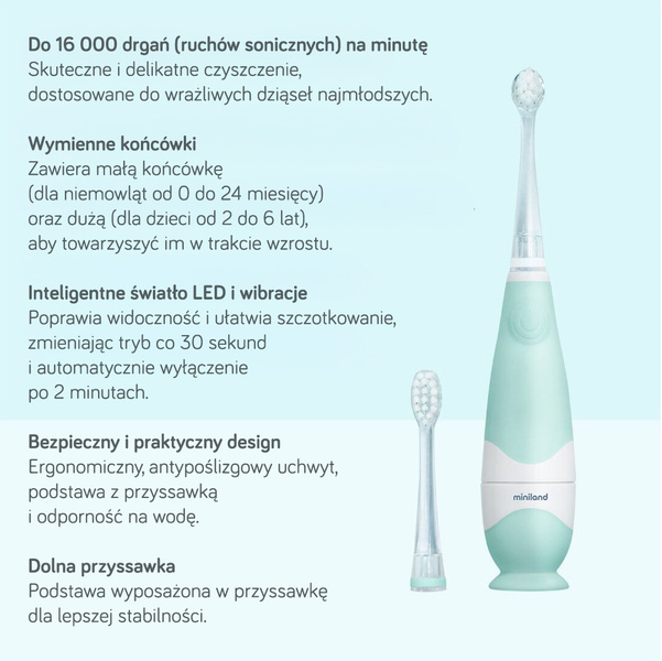Urządzenie posiada ergonomiczną, antypoślizgową rączkę, timer zmieniający wibracje co 30 sekund oraz automatyczne wyłączanie po 2 minutach, co pomaga w nauce prawidłowej higieny jamy ustnej od najmłodszych lat.