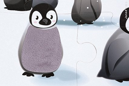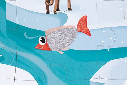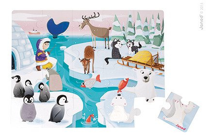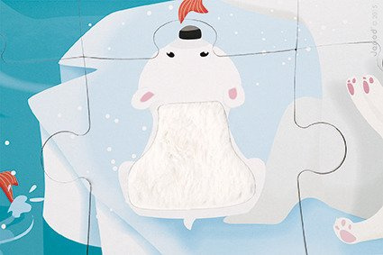 Duży zestaw puzzli sensorycznych francuskiej marki JANOD. Składa się z 20 elementów. Ułożony z nich obrazek przedstawia życie w lodowej krainie. Jej mieszkańców dziecko może poznać także sensorycznie – sierść czy skóra siedmiu zwierząt wykonane zostały z teksturowanych materiałów. Dotykanie różnorodnych tekstur imituje prawdziwe wrażenia empiryczne i rozwija dziecięcy zmysł dotyku. Wzbudza też dodatkowe zainteresowanie układanką. Puzzle mają spore rozmiary, a obrazek po ułożeniu to 65 na 50 cm. Puzzle zostały wykonane z trwałego kartonu, a ich kształty ułatwiają dziecku łączenie elementów.