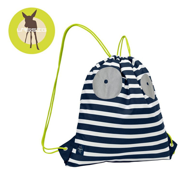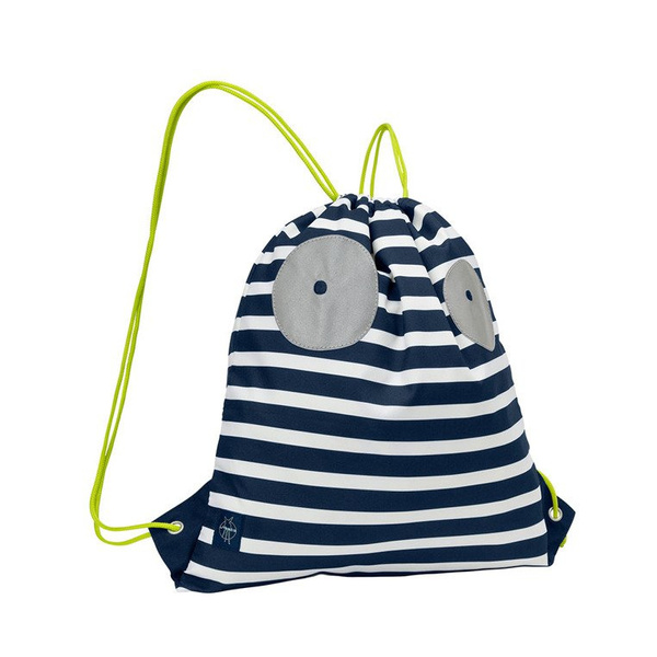 Ładny i praktyczny worek plecak niemieckiej marki LASSIG. Doskonały na strój sportowy lub obuwie na zmianę. Granatowy w białe paski i z seledynowymi troczkami. Jego przód zdobią spore okrągłe i odblaskowe oczy zabawnego potworka. Zamykany przez zaciśnięcie troczków, które służą jednocześnie jako ramiączka do noszenia na plecach. Lekki, wytrzymały, solidnie wykończony. Na worku znajduje się specjalna kieszonka z foliowym okienkiem i wizytówką, na której można umieścić imię dziecka i numer telefonu rodzica. Wykonany z materiału, który łatwo się czyści i jest odporny na wilgoć. Wszystkie torby i plecaki LASSIG wyprodukowane są z poszanowaniem środowiska, z materiałów wolnych od PCV, ftalanów, niklu czy kadmu.