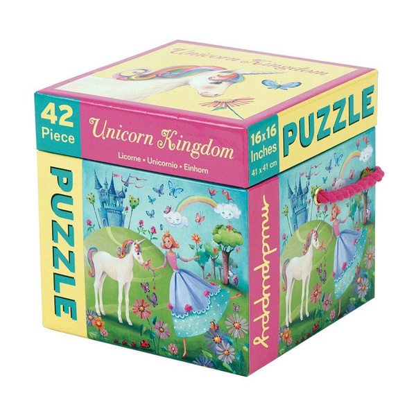 Puzzle w pudełku Królestwo jednorożca amerykańskiej marki MUDPUPPY składają się z 42 elementów średniej wielkości. Ułożony z nich obrazek ma kształt kwadratu o boku 41 cm i przedstawia bajkowy świat z jednorożcem, księżniczką, zamkiem, tęczą i łąką, pełną kwiatów. Ładny design i przyjazne barwy dodatkowo zachęcają malca do zabawy. Puzzle zapakowane są w estetyczne pudełko w kształcie sześcianu, z wygodną do przenoszenia rączką ze sznurka. Idealnie nadają się na prezent.