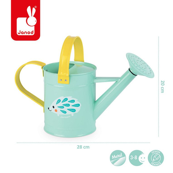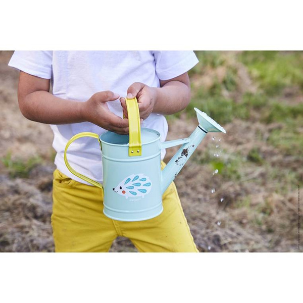Metalowa konewka z serii Mały ogrodnik francuskiej marki JANOD to idealna zabawka dla dziecka, lubiącego aktywność w ogrodzie i naśladowanie dorosłych. Ma jasnoniebieski kolor z motywem uroczego jeżyka oraz dwa żółte uchwyty – u góry i z boku. Konewka jest lekka i jednocześnie wystarczająco pojemna – dostosowana do możliwości małego dziecka. Jest trwała i estetycznie wykonana. Idealnie nadaje się na prezent. Do tej zabawki możesz dobrać inne z tej samej serii.