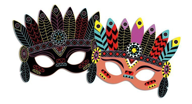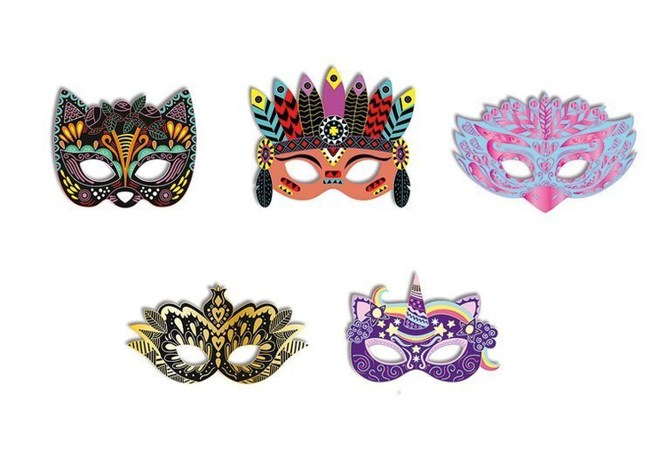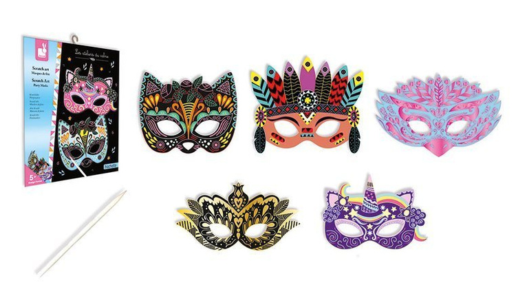 Zestaw kreatywny Do zdrapywania Maski karnawałowe francuskiej marki JANOD zawiera 5 masek z solidnego kartonu – indiańską, wenecką, indyjskiego kota, sowy oraz jednorożca. Maski są czarne, jedynie z kolorowymi konturami elementów, które ukazują się stopniowo w efekcie zdrapywania wierzchniej warstwy. Do zestawu dołączony jest plastikowy patyczek do zdrapywania. Zdrapywanie to dla dziecka długie godziny angażującej i jednocześnie uspokajającej, wyciszającej zabawy, a gotowe maski można nosić jako przebranie lub zrobić z nich wspaniałą dekorację dziecięcego pokoju. Zestaw zaprojektowano we Francji we współpracy z francuską grupą mediową i wydawniczą Hachette. Zapakowany jest w stylowe kartonowe pudełko. Idealnie nadaje się na prezent.