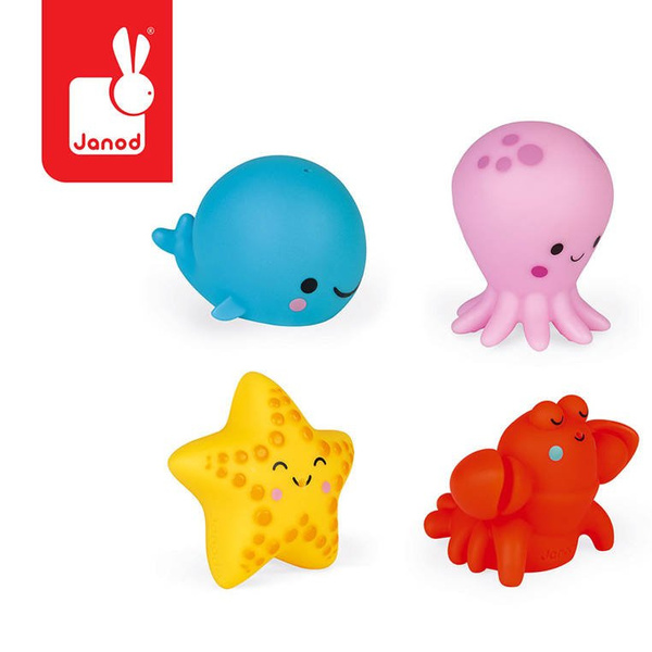Zestaw uroczych zwierzątek morskich francuskiej marki JANOD to 4 wytrzymałe zabawki z wodoodpornego tworzywa. W skład kompletu wchodzą: wieloryb, ośmiornica, krab i rozgwiazda. Wszystkie są poręczne i przyjemne w dotyku. Ściśnięte pod wodą, napełniają się, a po ich ponownym naciśnięciu, tryskają wodą. Mają intensywne, ładne kolory. Tworzenie opowieści o ich przygodach to doskonały sposób na wyciszenie i idealny umilacz czasu, spędzanego w wannie. Zabawkę zaprojektowano we Francji. Zapakowane jest w estetyczne pudełko z uchwytem. Idealnie nadaje się na prezent.