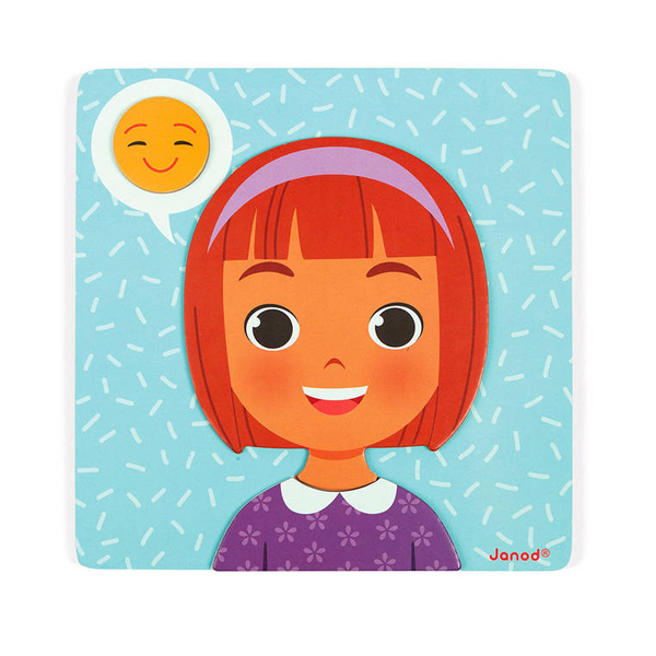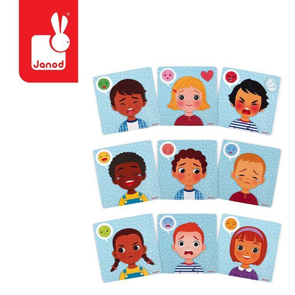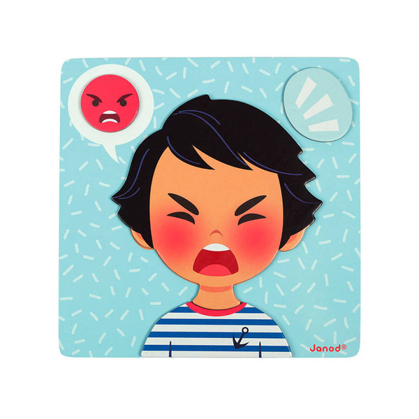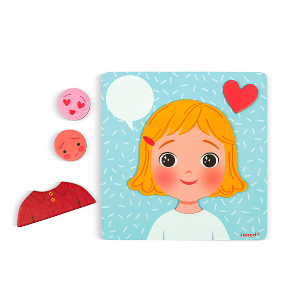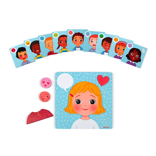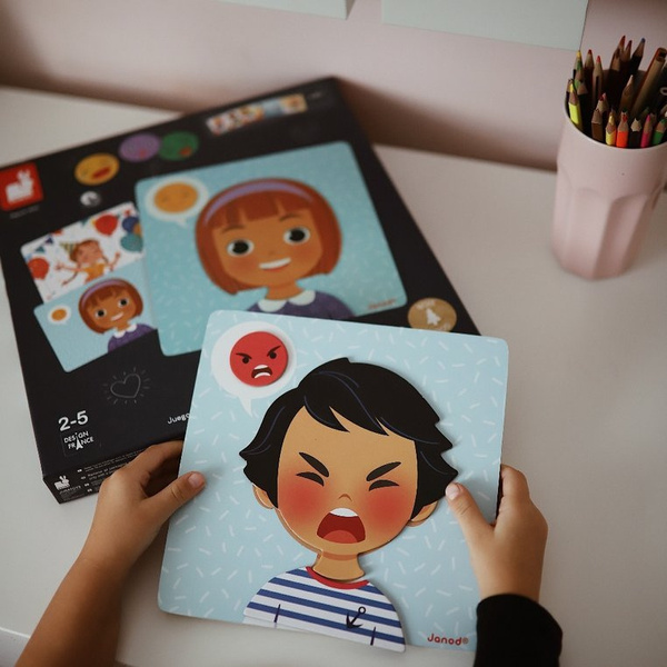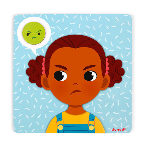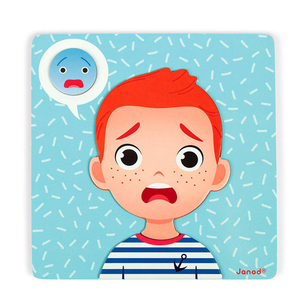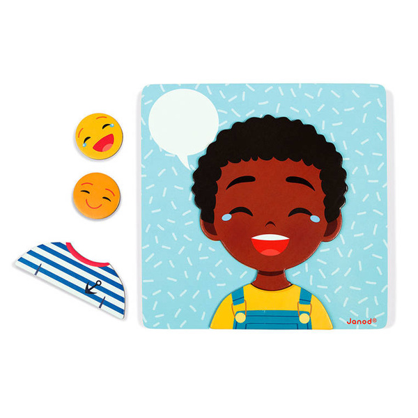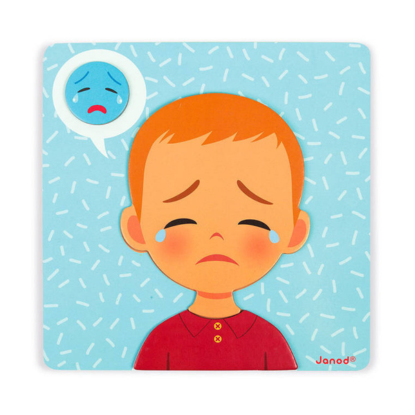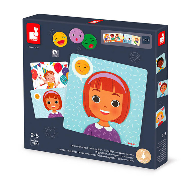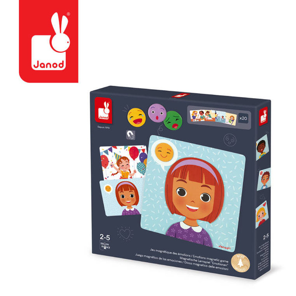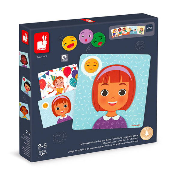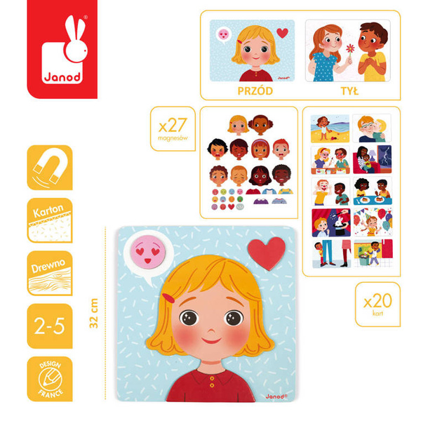 Magnetyczna układanka Emocje francuskiej marki JANOD to doskonała zabawka, rozwijająca wrażliwość i wyobraźnię. W skład zestawu wchodzi 20 dwustronnych kartonowych plansz. Po jednej ich stronie zaprezentowane są sytuacje, znane z codziennego życia, np. burza, wyrzucanie śmieci, wygłupy z kolegą czy nieudana babka z piasku, po drugiej zaś jest pokazana twarz, obrazująca przeżycia, które tym sytuacjom towarzyszą. Ponadto w zestawie jest 27 drewnianych magnesów: 10 dziecięcych buziek z minami, wyrażającymi emocje (np. płacz, łzy śmiechu, grymas niezadowolenia), 12 emotek i 5 części strojów, które można dobrać do postaci, oraz magnetyczna tablica, na której można umieszczać magnesy. Układanka ta będzie służyć dziecku przed bardzo długi czas i nieprędko się znudzi. Jest doskonała do ćwiczenia empatii, nauki radzenia sobie z trudnymi doświadczeniami, np. oswajania lęków i rozwijania inteligencji emocjonalnej.