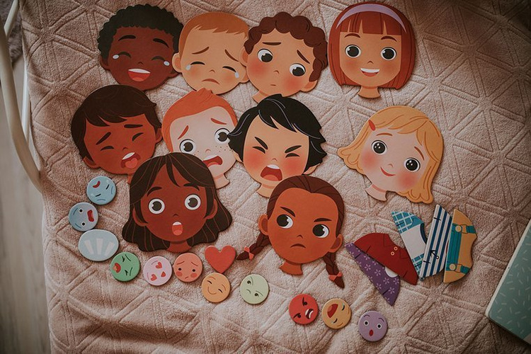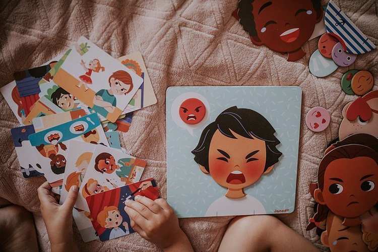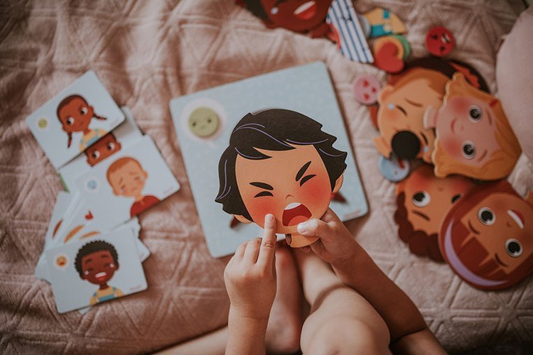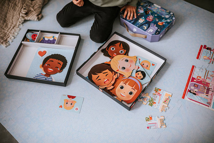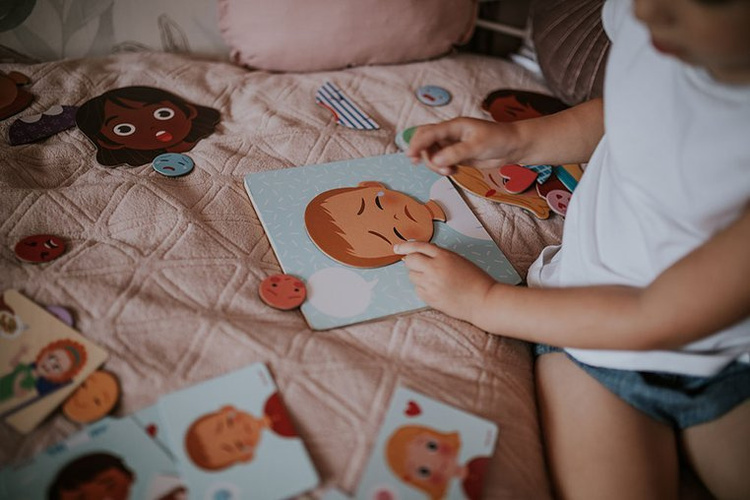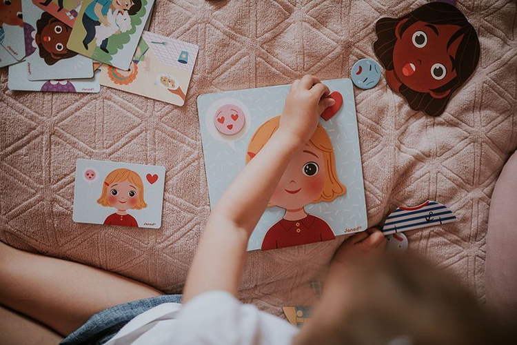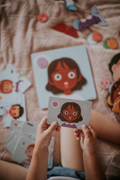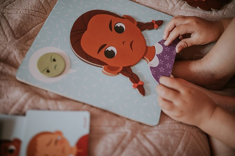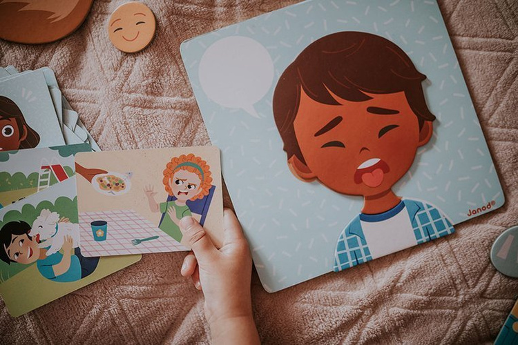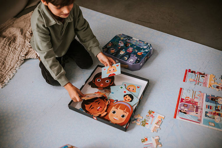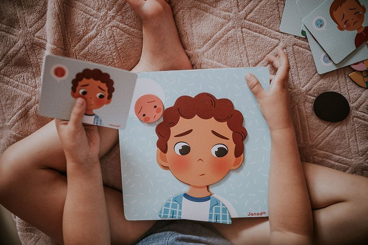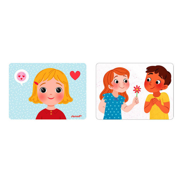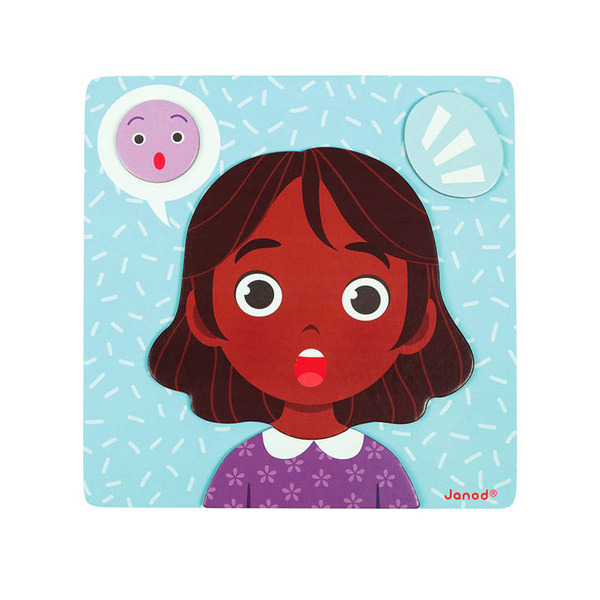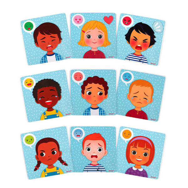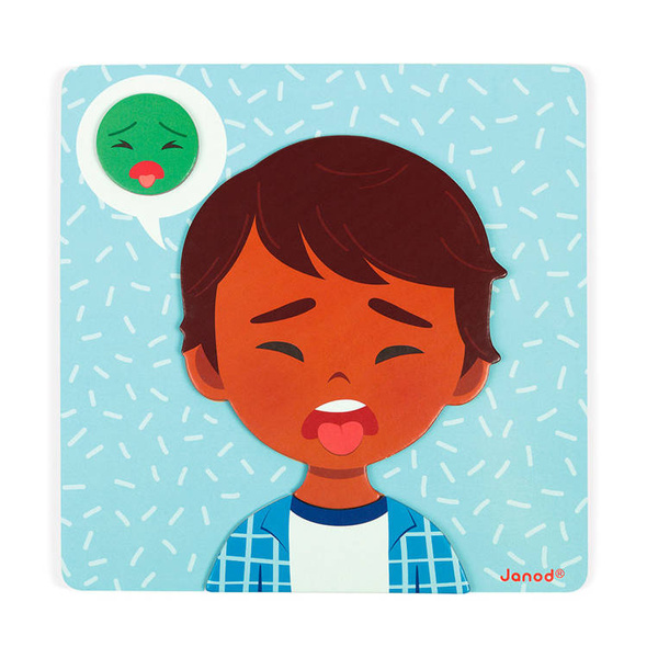 Magnetyczna układanka Emocje francuskiej marki JANOD to doskonała zabawka, rozwijająca wrażliwość i wyobraźnię. W skład zestawu wchodzi 20 dwustronnych kartonowych plansz. Po jednej ich stronie zaprezentowane są sytuacje, znane z codziennego życia, np. burza, wyrzucanie śmieci, wygłupy z kolegą czy nieudana babka z piasku, po drugiej zaś jest pokazana twarz, obrazująca przeżycia, które tym sytuacjom towarzyszą. Ponadto w zestawie jest 27 drewnianych magnesów: 10 dziecięcych buziek z minami, wyrażającymi emocje (np. płacz, łzy śmiechu, grymas niezadowolenia), 12 emotek i 5 części strojów, które można dobrać do postaci, oraz magnetyczna tablica, na której można umieszczać magnesy. Układanka ta będzie służyć dziecku przed bardzo długi czas i nieprędko się znudzi. Jest doskonała do ćwiczenia empatii, nauki radzenia sobie z trudnymi doświadczeniami, np. oswajania lęków i rozwijania inteligencji emocjonalnej.
