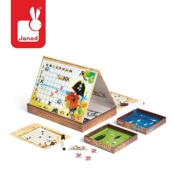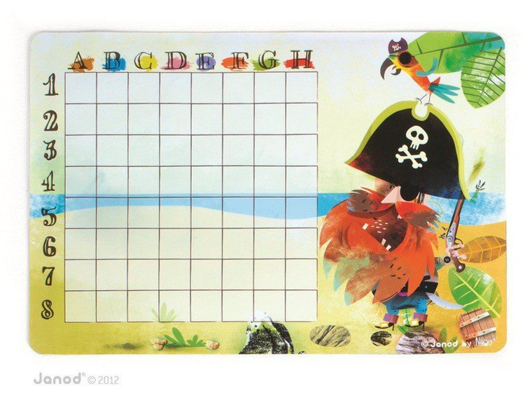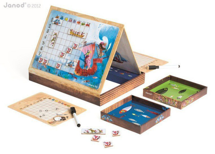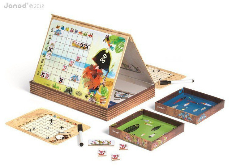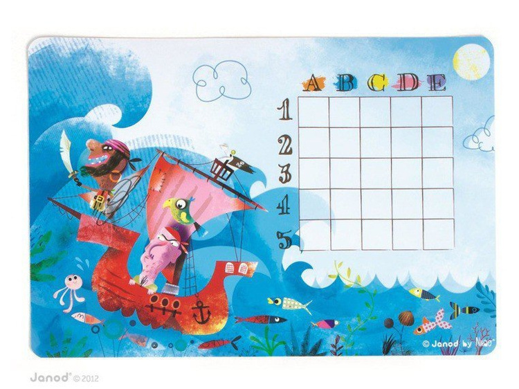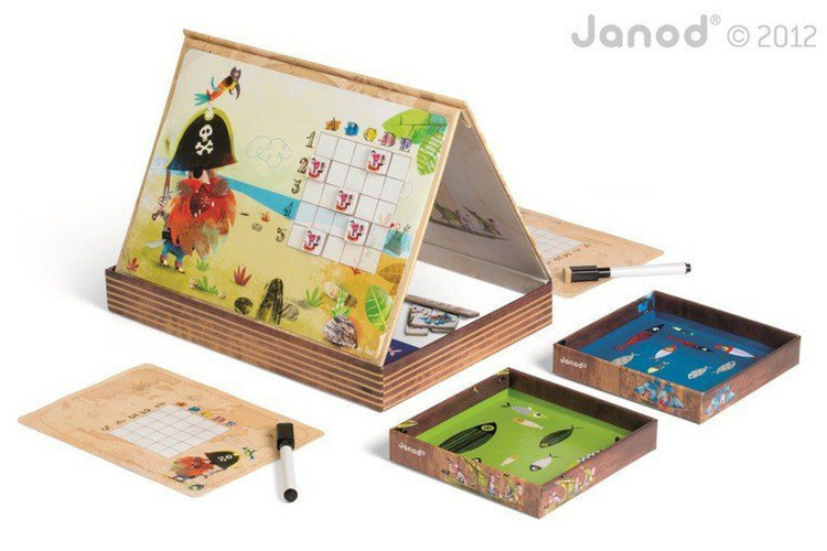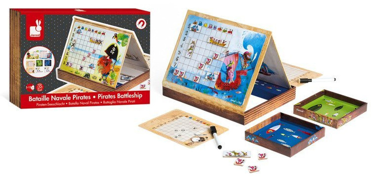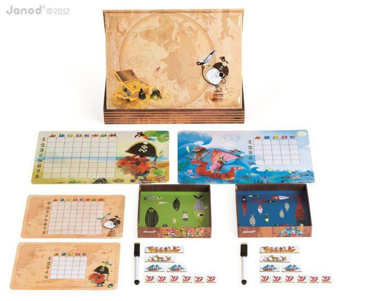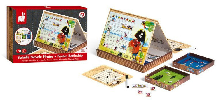 Gra Statki francuskiej marki Janod to wyjątkowa odsłona znanej gry w bitwę morską. Zamiast kartki i ołówka, Janod proponuje innowacyjne rozwiązanie – pięknie ilustrowane statki w postaci magnesów, które umieszcza się na dwóch magnetycznych planszach z motywem pirackim. Każdy z graczy dysponuje 10 magnesami ze statkami. Dodatkowo, gracze otrzymują ścieralne markery, karty do zaznaczania trafionych statków przeciwnika oraz gumkę. W bajecznie zaprojektowanym zestawie znajdują się także specjalne podkładki pod plansze, które umożliwiają przeciwnikom rozgrywkę bitwy morskiej bez podglądania floty przeciwnika. Plansze o dwóch poziomach trudności umożliwiają zaangażowanie się w zabawę młodszym i starszym dzieciom. Gra rozbudza wyobraźnię, myślenie strategiczne i planowanie. Wspaniała rozrywka dla całej rodziny! Gra zaprojektowana we Francji, zapakowana w estetyczne, kartonowe pudełko, idealne na prezent.