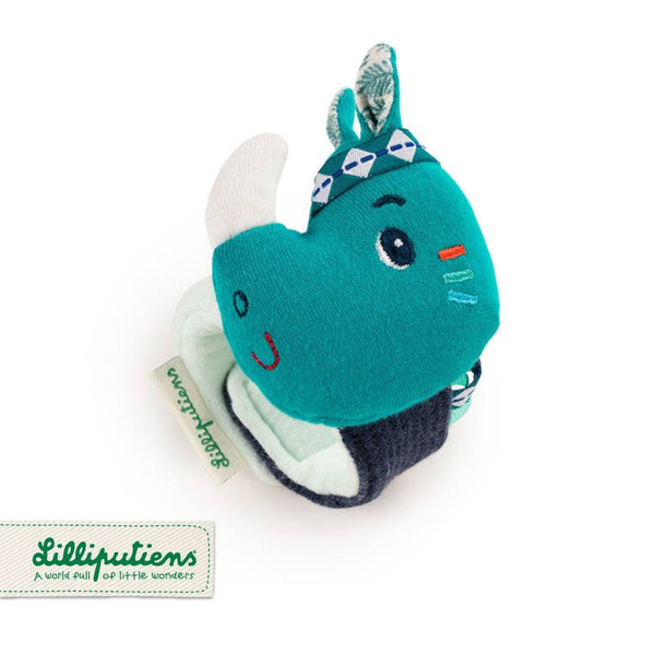 Pluszowa grzechotka na zwijanej bransoletce Nosorożec Marius belgijskiej marki Lilliputiens to niebanalna aktywizująca zabawka dla niemowląt. Miękka, kolorowa, uszyta z bawełny, bransoletka jest zapinana na rzep i można ją założyć na rączkę lub nóżkę maluszka. Szeleści przy pocieraniu. Zdobi ją główka - grzechotka radosnego niebieskiego Nosorożca Mariusa ze stymulującymi sensorycznie uszkami i rogiem. Zabawka rozwija małą motorykę (potrząsanie), aktywizuje zmysł słuchu (szeleści, grzechocze), wzroku i dotyku.