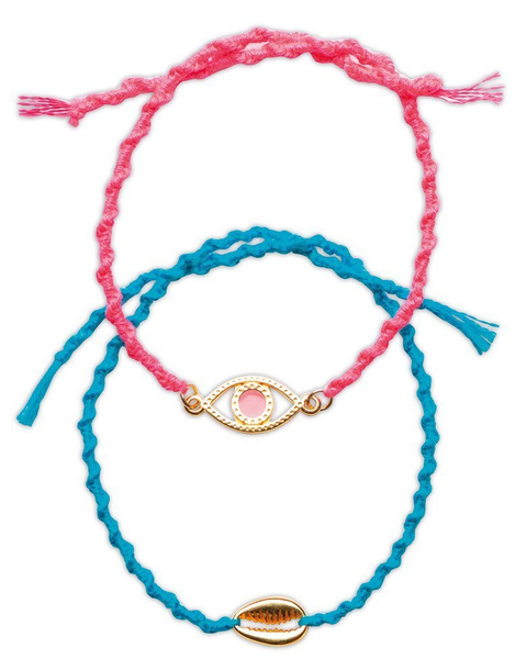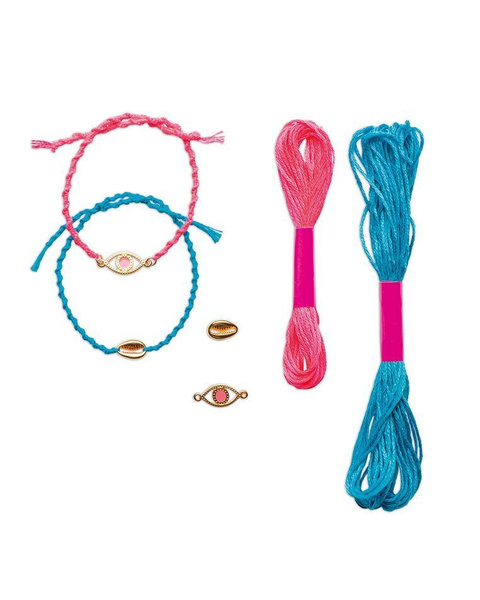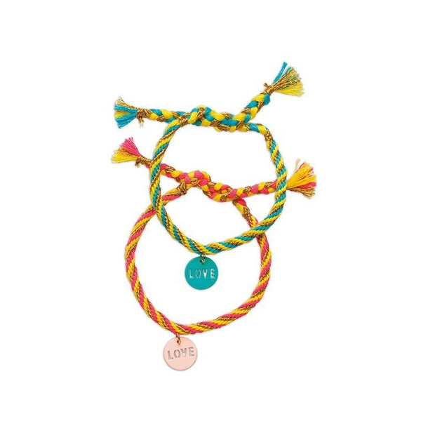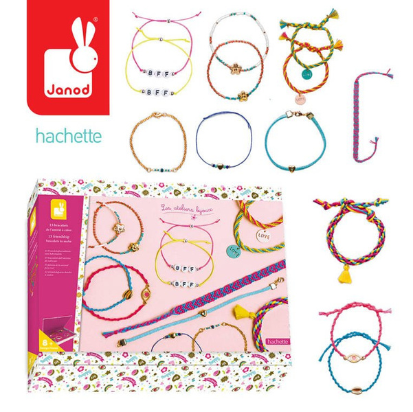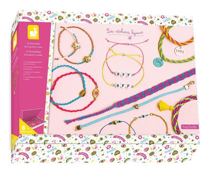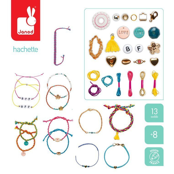 Zestaw do tworzenia biżuterii Bransoletki przyjaźni francuskiej marki JANOD pozwoli stworzyć łącznie 13 sztuk biżuterii – kolorowych bransoletek z koralików, plecionej muliny czy sznureczków z zawieszkami. W jego skład wchodzi łańcuszek, kilka motków nici (m. in. żółta, złota, różowa, jasnoniebieska i ciemnoniebieska), wiele koralików i zawieszek, m. in. serduszka, kółka z napisem LOVE, kwiatki, muszelka, oko, żółty chwościk oraz 6 białych koralików z czarnymi literkami, z których można dwa skróty BFF (best friends forever – najlepsi przyjaciele na zawsze). Do zestawu dołączona jest szczegółowa instrukcja jak krok po kroku wykonać poszczególne ozdoby. Dzięki niej w kilka chwil Twoje dziecko może stać się kreatywnym jubilerem! Projektowanie i tworzenie biżuterii to długie godziny angażującej i jednocześnie uspokajającej, wyciszającej zabawy, a po skończonej pracy powstałe dzieła mogą jeszcze długo służyć jako ozdoby lub podarunki dla bliskich.