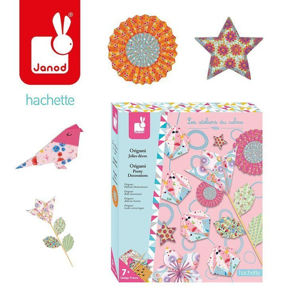 Zestaw kreatywny do tworzenia origami francuskiej marki JANOD zawiera 70 kwadratowych arkuszy ozdobnego papieru w kwiatowe i graficzne wzory, 3-metrowy sznurek, 10 metalowych koralików i 2 cienkie drewniane patyczki. Załączona instrukcja pozwala na stworzenie m.in. girlandy z przestrzennymi elementami, papierowego kwiatka i parasolki, ptaszka i innych figur. Po skończonej pracy dzieła dziecka mogą mu jeszcze długo służyć jako ozdoby lub podarunki dla bliskich.