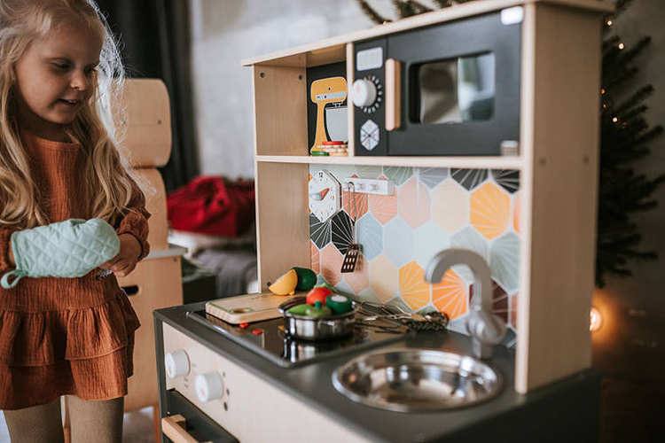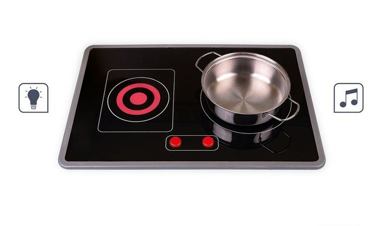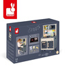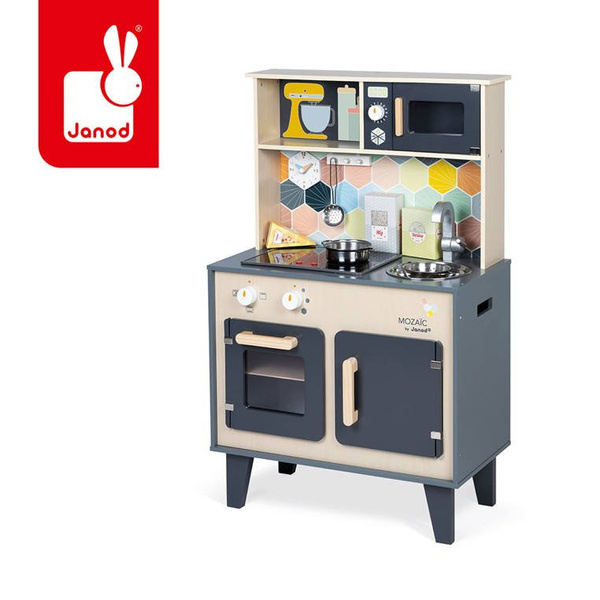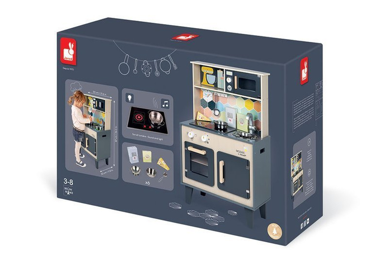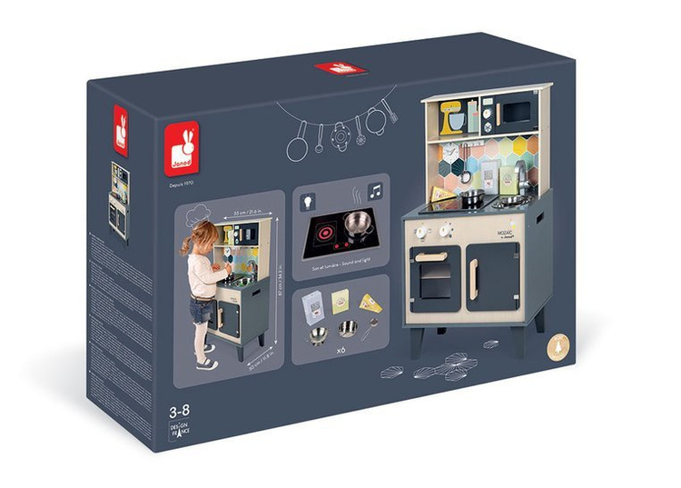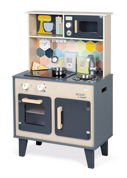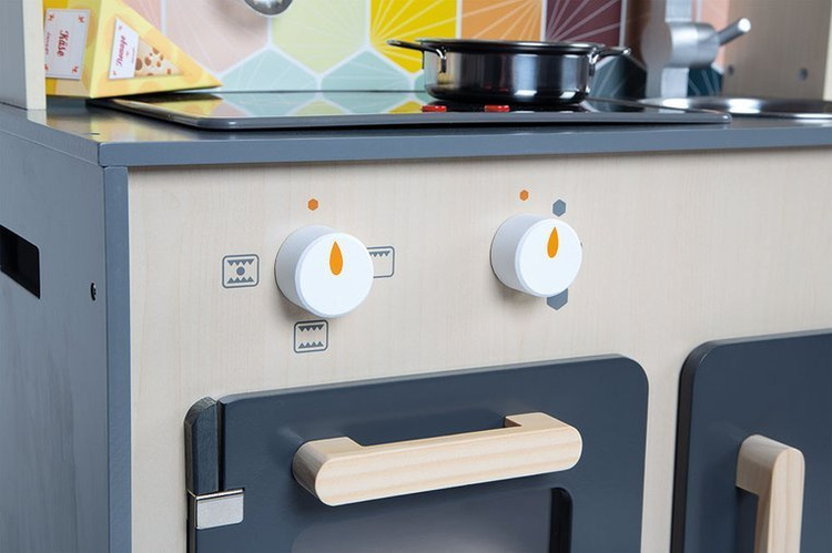Duża drewniana kuchnia francuskiej marki JANOD sprawi mnóstwo radości każdemu dziecku, pozwoli mu bezpiecznie uczestniczyć w codziennych czynnościach, czy rozwijać pasję gotowania. W skład zestawu wchodzi przepiękny mebel w naturalnym jasnym odcieniu drewna i stylowej matowej czerni – z okrągłym metalowym zlewem (ze srebrną baterią), dwoma „elektrycznymi” palnikami, piekarnikiem i szafką z drzwiczkami na dole, a na górze – z otwartą półką (na jej plecach narysowane są pojemniki i mikser) i otwieraną mikrofalą z pokrętłem. W komplecie są ponadto akcesoria: naczynia z metalu – garnek, durszlak i łyżka do odcedzania oraz kartonowe produkty – ryż, ser i mąka. Kuchnia wyposażona jest w dwa pokrętła przy piekarniku i dwa przyciski na płycie grzewczej, sygnał dźwiękowy oraz podświetlenie typowe dla „rozgrzanych” palników (baterie nie są załączone). Na ściance ma namalowaną mozaikę z kafelków w modnym kształcie heksagonu i w pięknych, pastelowych kolorach, potrójny drewniany wieszak i zegar. Z boku zaś uchwyty, ułatwiające przenoszenie zabawki. Dzięki sporym rozmiarom i akcesoriom może się nią bawić jednocześnie więcej niż jedno dziecko.