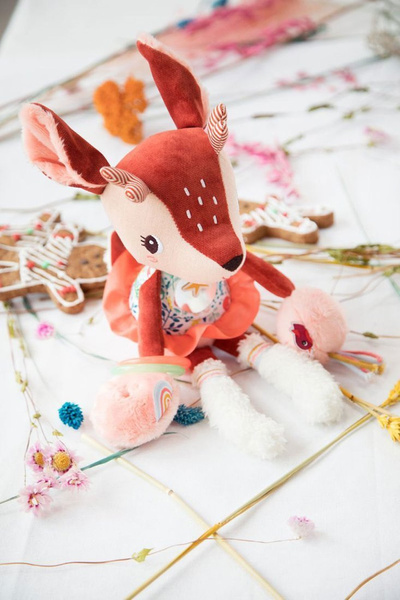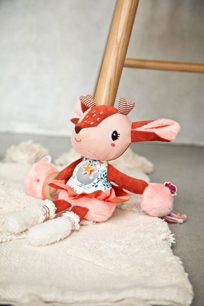 Przytulanka aktywizująca z kolekcji Sarenka Stella belgijskiej marki Lilliputiens to niebanalne, miękkie i wielofunkcyjne źródło rozrywki i nauki dla ciekawskich maluszków. Ma postać brązowej sarenki o imieniu Stella w zwiewnej spódniczce cheerleaderki. Sarenka ma spore szeleszczące uszy, różki, ogonek i białe skarpetki na nóżkach. Na brzuszku ma bezpieczne, miękkie lusterko z naszywką gwiazdy. Jedna z łapek to grzechotka z sensorycznymi sznureczkami i naszywką ptaszka, druga posiada otwór i dwie giętkie obręcze, których można używać jako gryzaków. Zabawka jest solidnie wykonana i w pełni bezpieczna. Zaskakuje i pobudza dziecięcą wyobraźnię. Rozwija małą motorykę (chwytanie, potrząsanie, pociąganie, ugniatanie), aktywizuje zmysł słuchu (szeleści, grzechocze), wzroku (lusterko) i dotyku (różne wypustki i tkaniny), a dzięki gryzakom – przynosi ulgę w trudnym okresie ząbkowania.