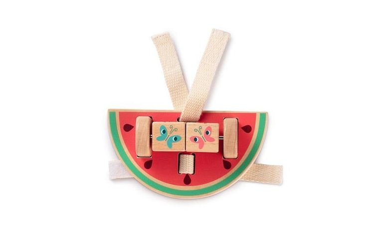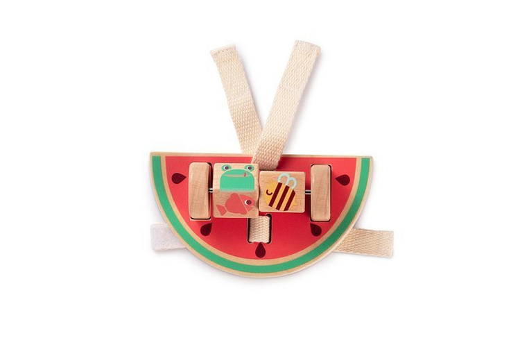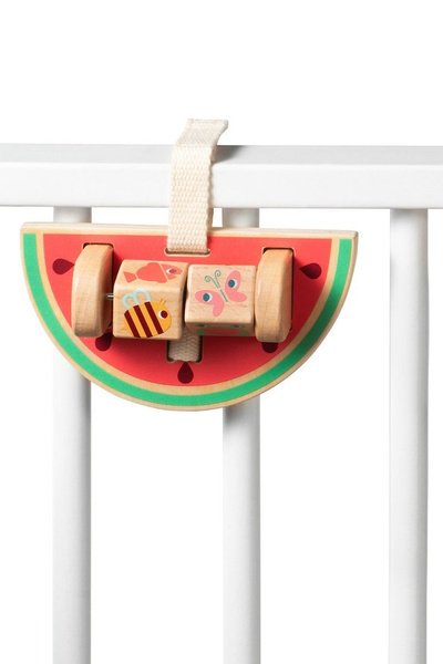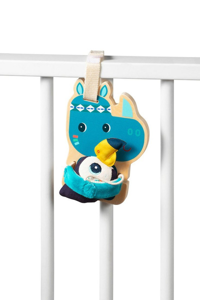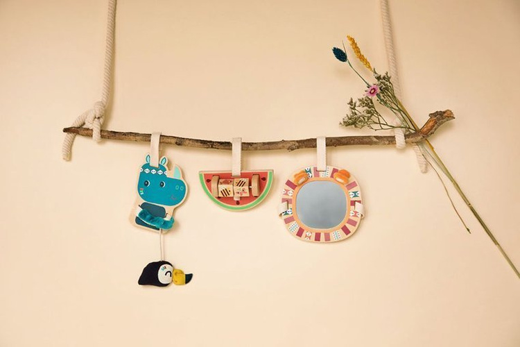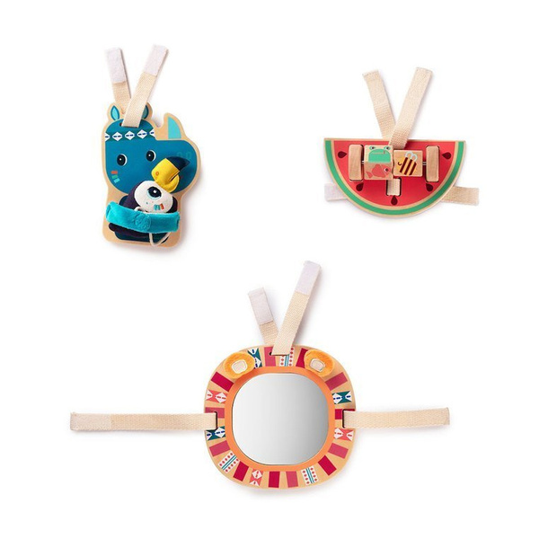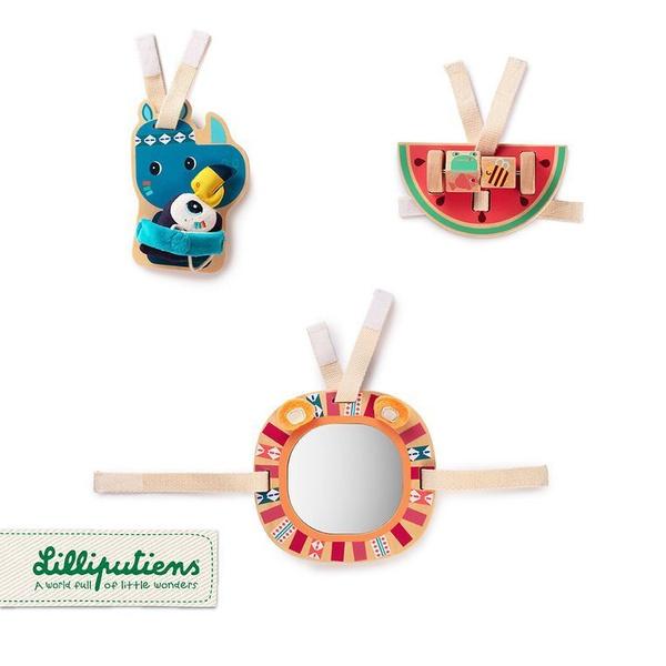 Zestaw 3 zawieszek aktywizujących z kolekcji Nosorożec Marius belgijskiej marki Lilliputiens to niebanalne zabawki z naturalnego drewna, angażujące dziecko na wiele godzin. W skład zestawu wchodzą: drewniany nosorożec Marius z długimi łapkami, w których trzyma pluszowego, szeleszczącego tukana Pabla, drewniany plaster arbuza z metalowym drążkiem z 2 klockami do obracania i grafikami zwierzątek na nich, a także lusterko w drewnianej ramie z grafiką lwiej grzywy i odstającymi uszami lwa Jacka. Zawieszki posiadają rzepy do mocowania, np. do pałąka w wózku, nosidełku, foteliku samochodowym, macie czy do barierki łóżeczka. Zabawka jest solidnie wykonana i w pełni bezpieczna. Rozwija koordynację ręka-oko, małą motorykę (chwytanie, potrząsanie, obracanie, ugniatanie), aktywizuje zmysł słuchu (szeleści), wzroku (lusterko) i dotyku.