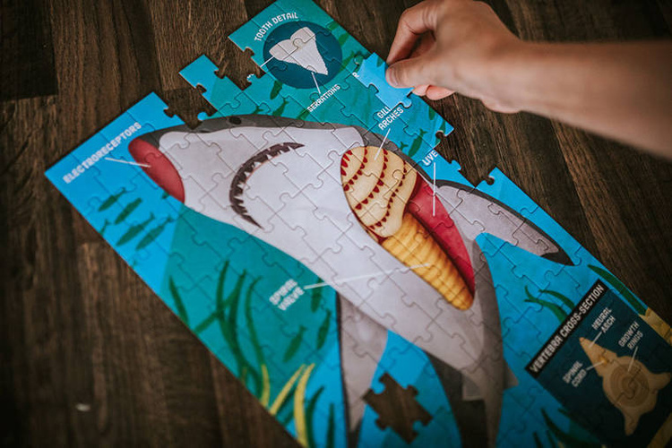 Zestaw puzzli edukacyjnych Anatomia zwierząt amerykańskiej marki MUDPUPPY to 3 układanki po 100 elementów każda, przedstawiające na barwnych i pełnych szczegółów ilustracjach (21,5 x 38 cm) jedne z najciekawszych gatunków drapieżników, tj. tygrysa bengalskiego, żarłacza białego i niedźwiedzia polarnego. Ich ułożenie to nie tylko rozrywka, ale też nauka – opisy na obrazkach pozwalają dziecku poznać specyficzne cechy tych zwierząt, jak np. funkcjonowanie tygrysich pazurów, budowę zęba rekina czy szczęki niedźwiedzia. Ponadto do zestawu dołączona jest broszura w języku angielskim i polskim z ciekawymi faktami naukowymi na temat każdego z gatunków. Autorem ilustracji jest amerykański grafik i miłośnik przyrody Jonathan Woodward. Wyjątkowy design i przyjazne barwy dodatkowo zachęcają dziecko do zabawy. Puzzle zapakowane są w estetyczne pudełko. Idealnie nadają się na prezent.