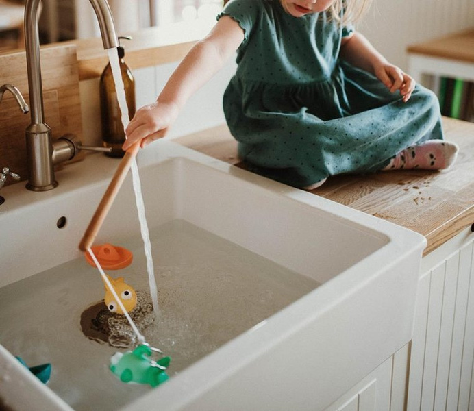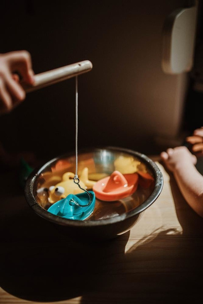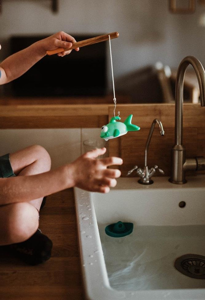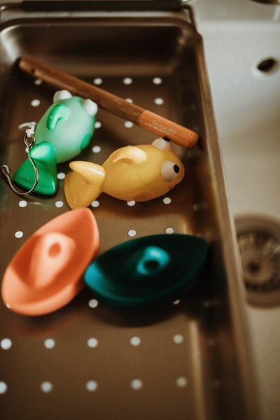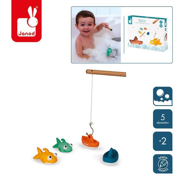 Zestaw do wędkowania w kąpieli francuskiej marki JANOD składa się z 2 gumowych rybek i 2 gumowych żaglówek oraz poręcznej drewnianej wędki z bezpiecznym (zaokrąglonym na końcu) haczykiem. Zarówno rybki, jak i łódeczki mają otwory, dzięki którym można je łowić na wędkę. Wyróżnia je niebanalny design i ładne, intensywne kolory (pomarańczowy, niebieski, jasny turkus i żółty). Zestaw to idealny umilacz czasu, spędzanego w wannie. Zabawkę zaprojektowano we Francji. Zapakowane jest w estetyczne pudełko. Idealnie nadaje się na prezent.