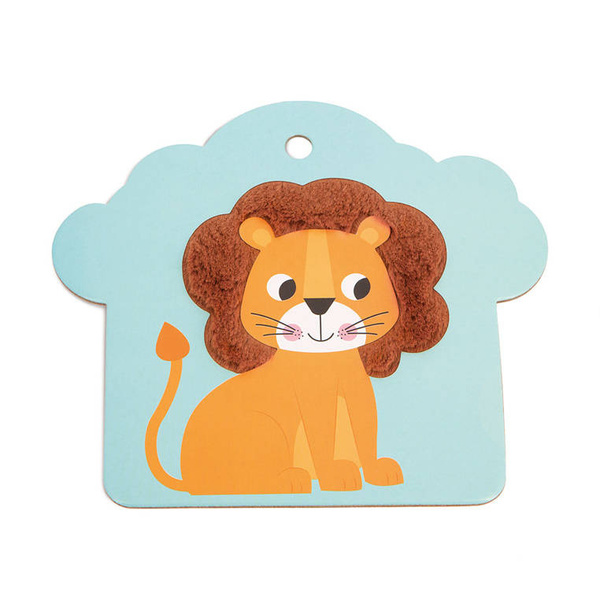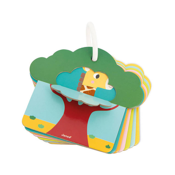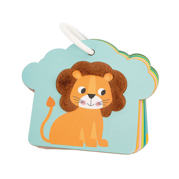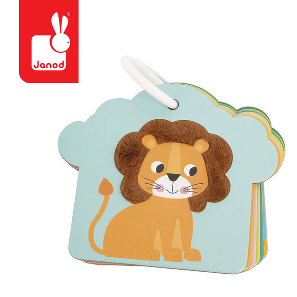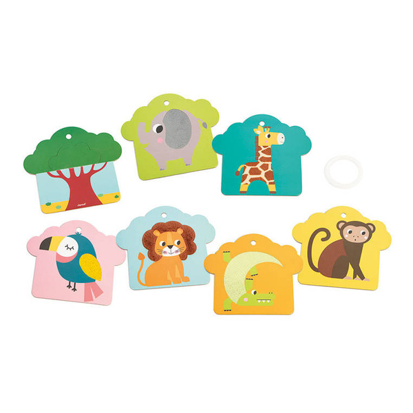 Zestaw kart sensorycznych Sawanna francuskiej marki JANOD. Składa się z 7 elementów: 1 karty z otwieranym elementem (drzewo) i 6 kart ze zwierzętami, zamieszkującymi sawannę (małpa, słoń, lew, papuga, żyrafa, krokodyl), których sierść, futro lub skóra wykonane zostały z teksturowanych materiałów. Dotykanie różnorodnych faktur imituje prawdziwe wrażenia empiryczne i rozwija dziecięcy zmysł dotyku. Wzbudza też dodatkowe zainteresowanie zabawką. Karty mają kształt drzewa i spore, poręczne rozmiary – 18 x 16,1 cm, są zawieszone na otwieranym kółku, stąd łatwo zabrać je na spacer lub w podróż, a niełatwo zgubić. Po rozczepieniu i zdjęciu z kółka można je np. rozłożyć na podłodze lub powiesić w pokoju malucha.